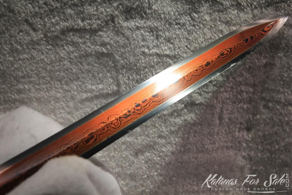 Blade: 1060 High Carbon Steel with brown acid dye engraved pattern in centre