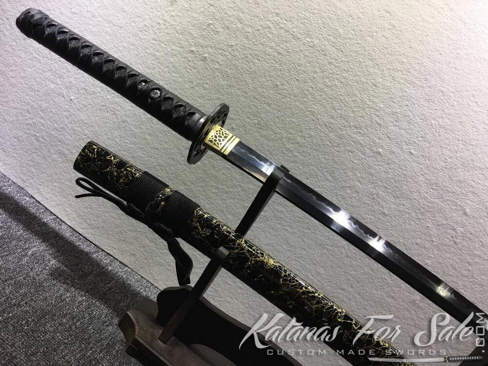 Katana sword made of T10 Folded Clay Tempered Steel with Hon Sanmai Multiple-refined Steel with Matt Black Hand-Drawn Rose Hardwood Saya and Buffalo Horns. The handle is Black Silk Wrap with White Samegawa