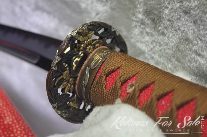Tsuka (Mango): Black And Red Rayon Silk Ito Wrap with Red Samegawa