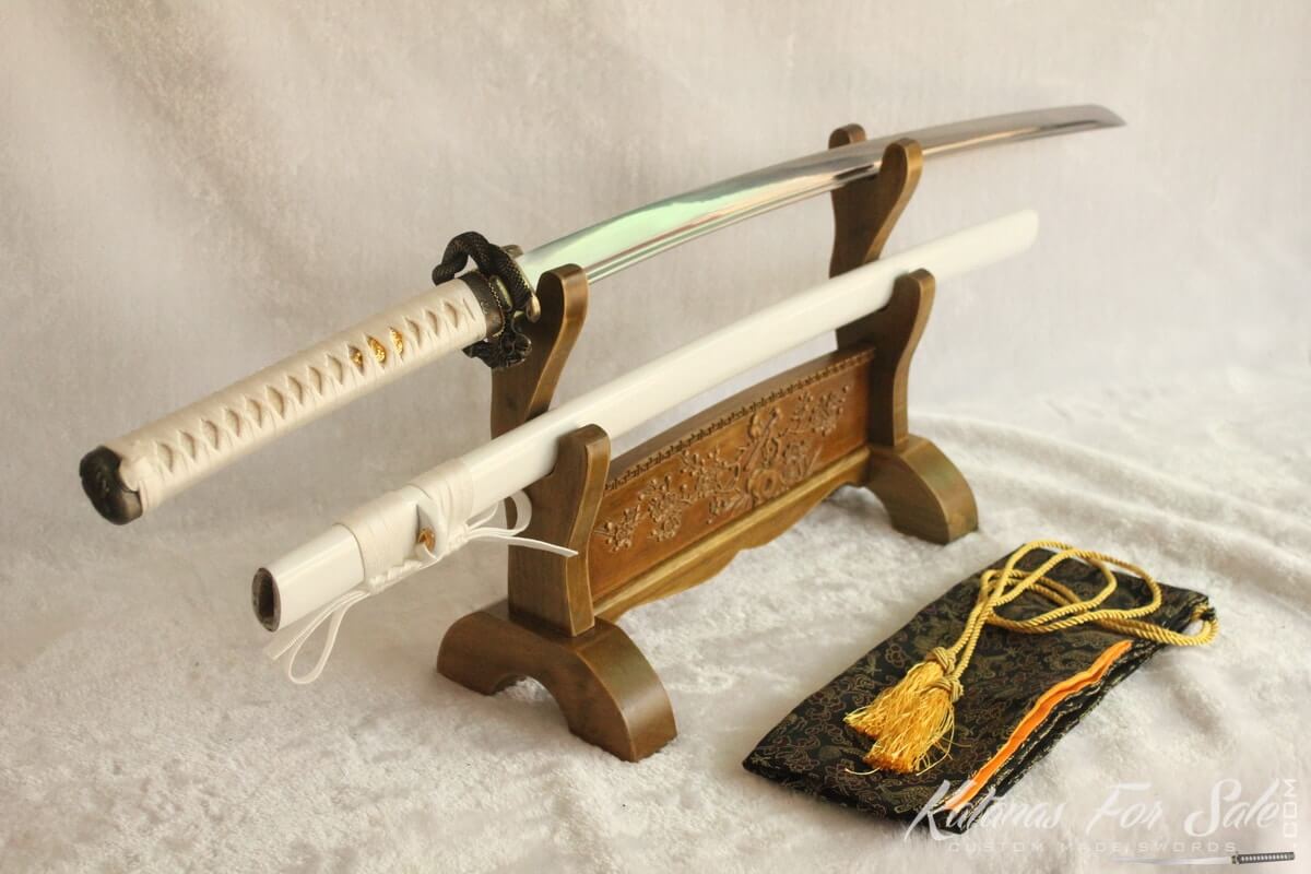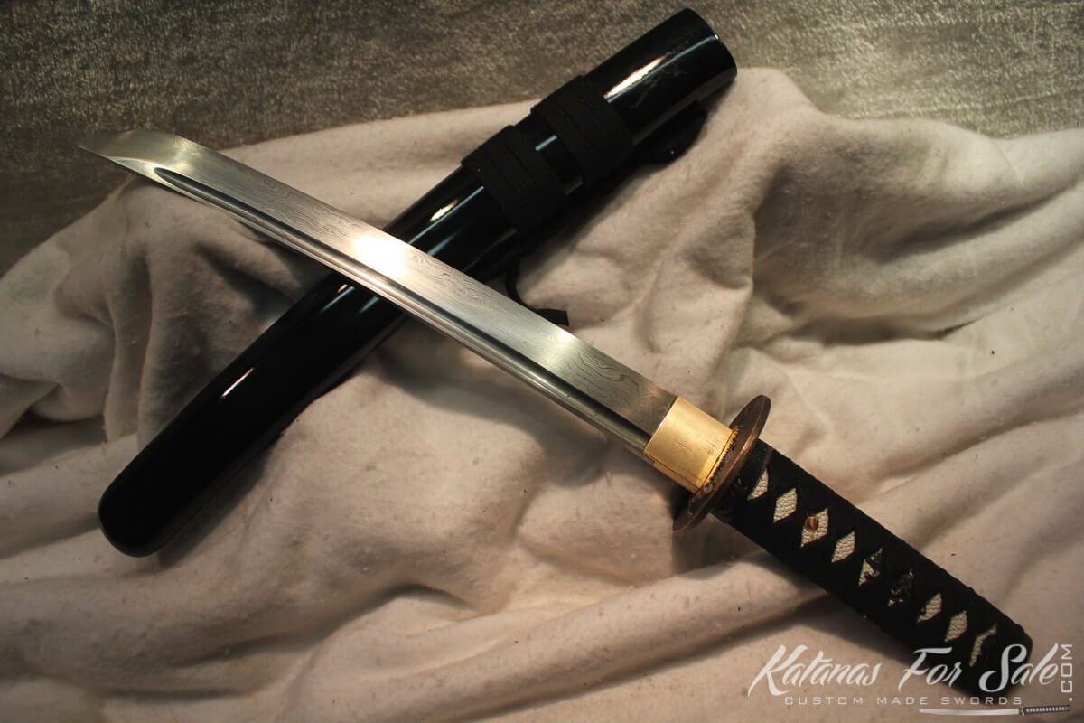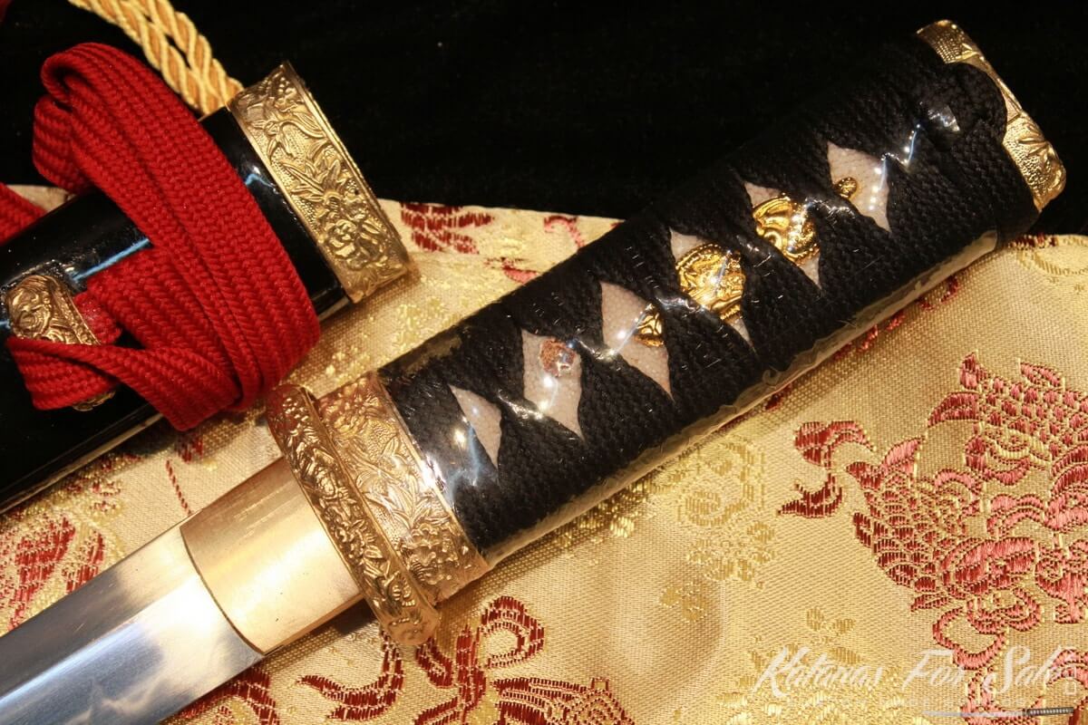 Acero Templado a la Arcilla T10 Hand forged Tanto, Black Semi Red Ray Skin Saya with Buffalo Horn and Black And Red Rayon Silk Ito Wrap with Red Samegawa