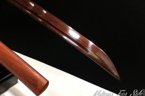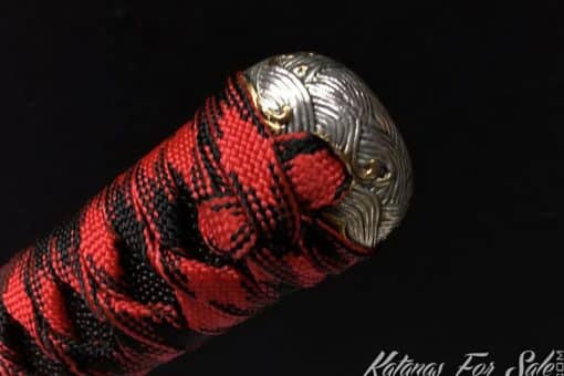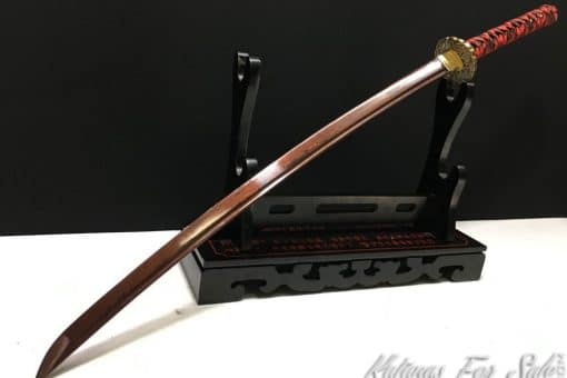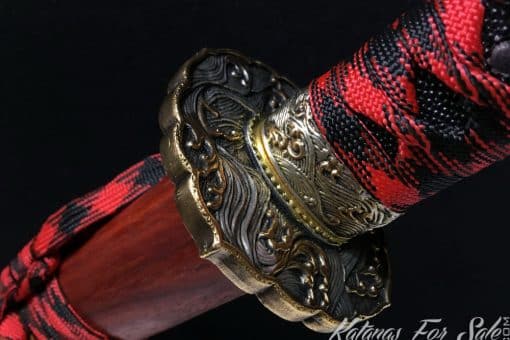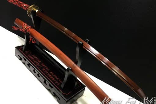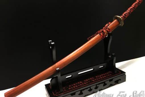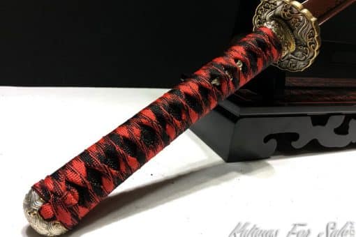 This Damascus Katana is made of 1095 Folded Steel with Red Acid Dye, the Saya is made of Redwood and the blade featuresa single bohi, the Tsuka is black and red rayon silk wrap with black Samegawa.