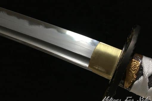 T10 Folded Clay Tempered Steel with Feather Hadori Polish and Kiriha Zukuri Kissaki Katana Blade, Gloss White Saya and White Rayon Silk Ito Wrap with Black Samegawa