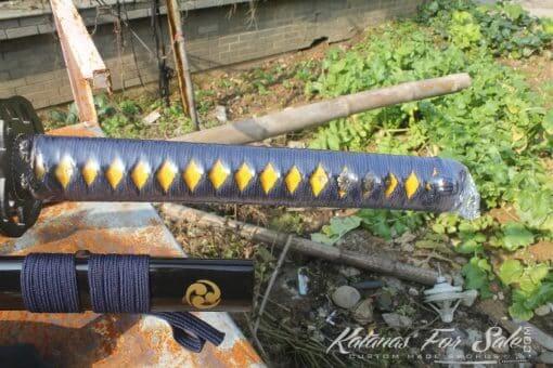 This blade features a high quality copper Japanese blossom Tsuba fuchi and kashira, black hardwood saya with hand printed Japanese crests, authentic yellow ray skin samegawa handle, full tang and secured by 2 mekugi pins.