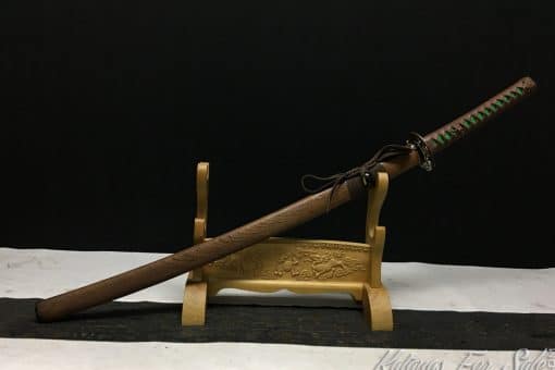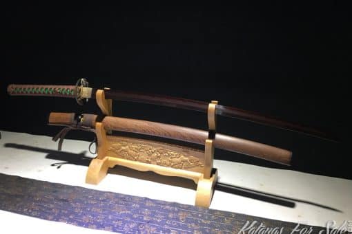 T10 Folded Clay Tempered Steel with Hadori Polish & Red Acid Dye Samurai Katana, Rosewood Saya with Buffalo Horn and Brown Leather Ito Wrap with Green Samegawa