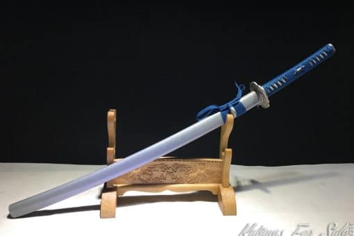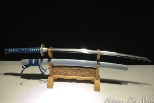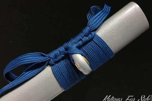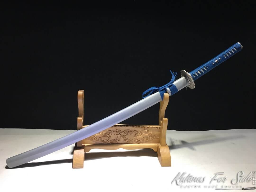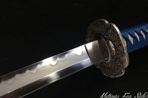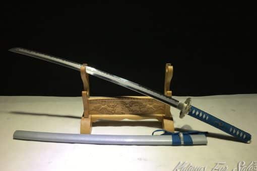 T10 Clay Tempered Steel with Hadori Polish Katana, Silver Hardwood Saya and Blue Rayon Silk Ito Wrap with Silver Samegawa